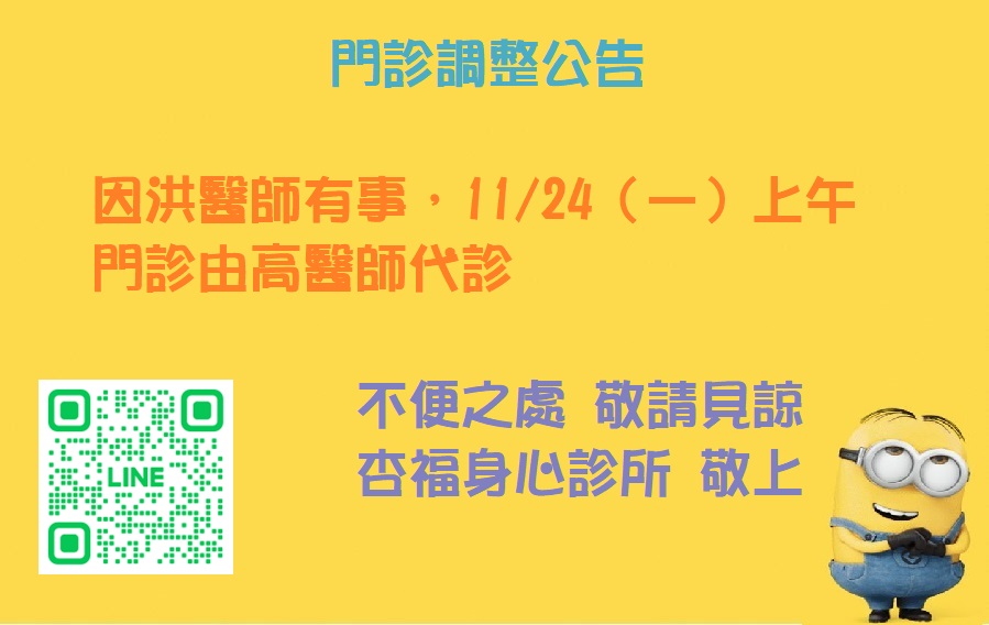 門診調整公告 因洪醫師有事,11/24(一)上午門診由高醫師代診